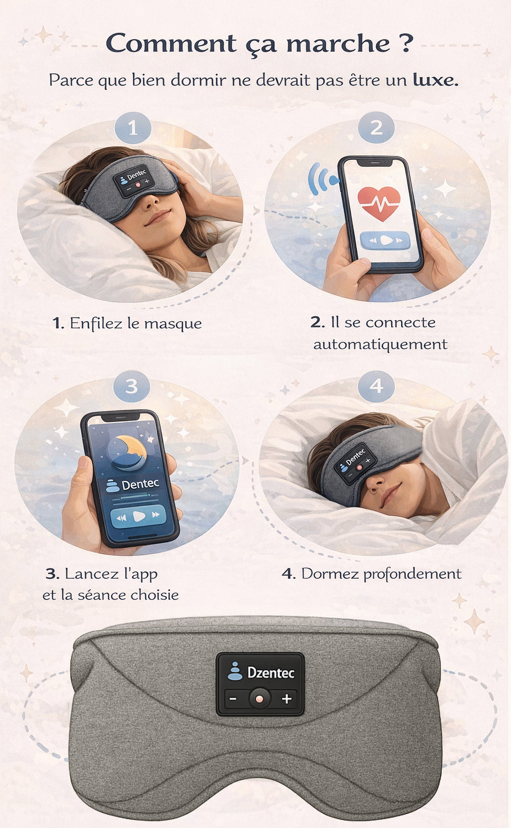 Retrouvez enfin des nuits paisibles avec le masque de sommeil Dzentec™. il vous aide à vous endormir plus vite, réduire le stress et plonger dans un sommeil profond