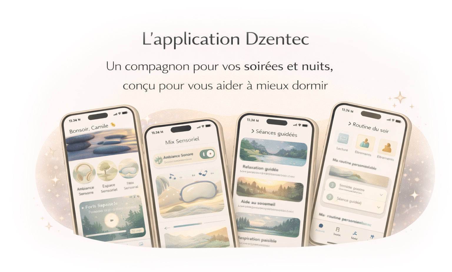 Accédez à des sons apaisants, des séances guidées, des routines du soir, mais aussi à tout un univers de partage entre utilisateurs : conseils, défis bien-être et contenus adaptés à vos besoins.
